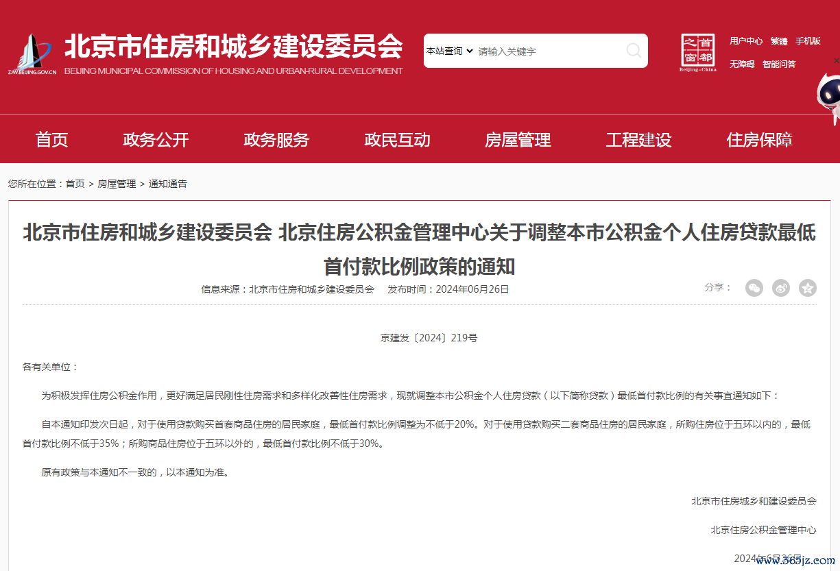 北京市住房和城乡建设委员会 北京住房公积金管理中心关于调整本市公积金个人住房贷款最低首付款比例政策的通知 京建发〔2024〕219号 各有关单位: 为积极发挥住房公积金作用,更好满足居民刚性住房需求和多样化改善性住房需求,现就调整本市公积金个人住房贷款(以下简称贷款)最低首付款比例的有关事宜通知如下: 自本通知印发次日起,对于使用贷款购买首套商品住房的居民家庭,最低首付款比例调整为不低于20%。对于使用贷款购买二套商品住房的居民家庭,所购住房位于五环以内的,最低首付款比例不低于35%;所购商品...