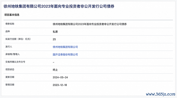 上交所公司债券项目信息平台显示专业炒股配资网平台专业炒股配资网平台,徐州地铁集团有限公司25亿元私募债项目状态更新为“终止”,更新日期为2024年5月24日。