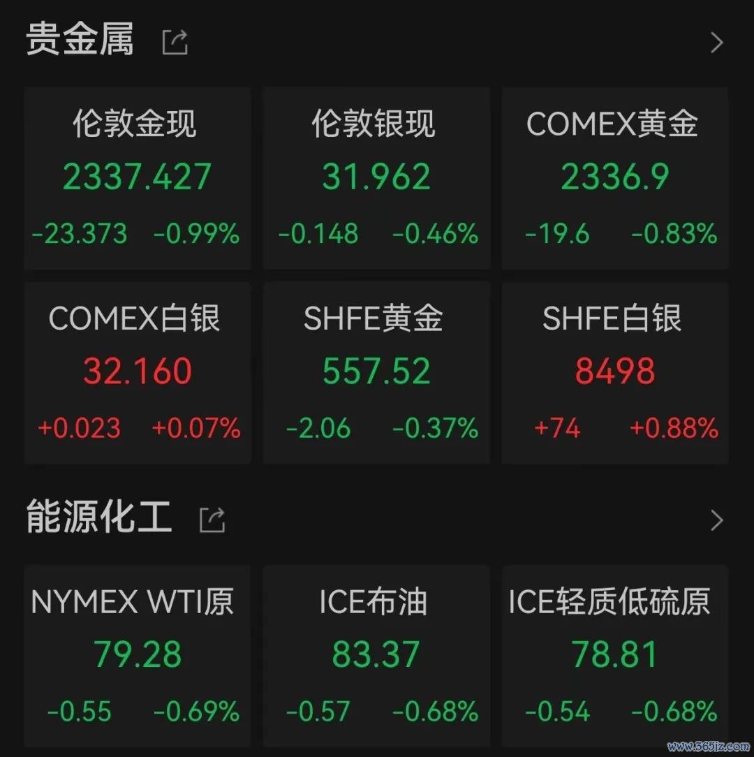 数据显示,截至北京时间5月30日5:50,COMEX黄金期价跌0.83%,报2336.9美元/盎司;NYMEX原油期货主力合约、ICE布油期货主力合约双双下跌。