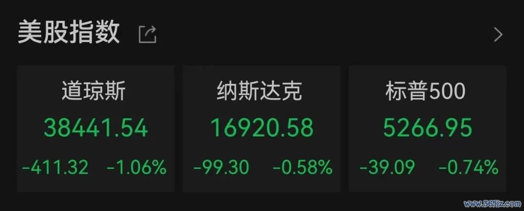 当地时间5月29日,美股三大股指集体调整,道指跌幅最为明显,单日回调逾400点。数据显示,截至收盘,道指跌1.06%,报38441.54点;纳指跌0.58%,报16920.58点;标普500指数跌0.74%,报5266.95点。