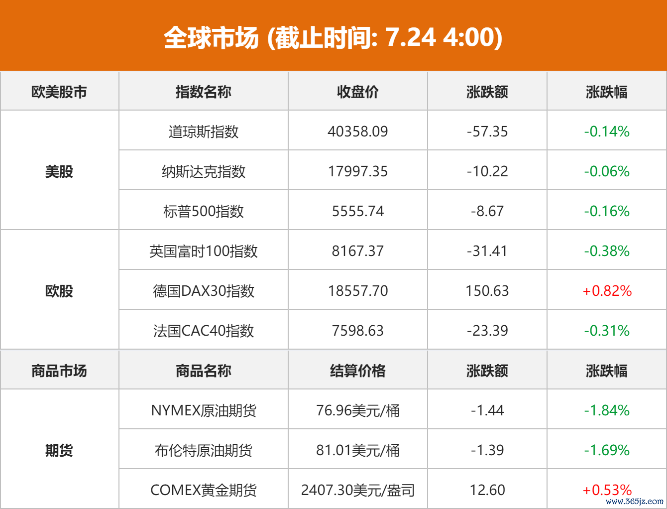 商品市场:国际油价下跌。截至当天收盘,纽约商品交易所9月交货的轻质原油期货价格下跌1.44美元,收于每桶76.96美元,跌幅为1.84%;9月交货的伦敦布伦特原油期货价格下跌1.39美元,收于每桶81.01美元,跌幅为1.69%。国际金价上涨,截至当天收盘,COMEX黄金期货主力合约上涨12.60美元/盎司,涨幅0.53%,报2407.3美元/盎司。