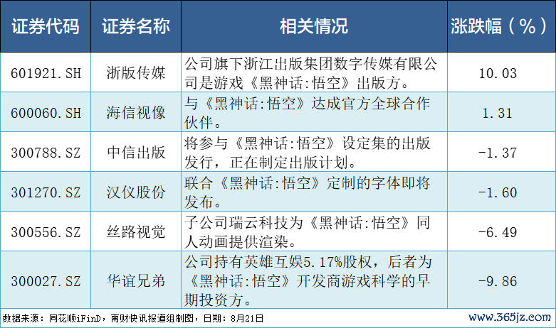 另据南财快讯记者梳理,涉及《黑神话:悟空》的A股上市公司名单如下: