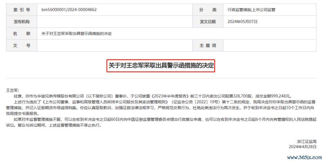 浙江证监局表示,经查,王忠军作为上市公司华谊兄弟的董事长,于公司披露《2023年半年度报告》前三十日内卖出公司股票32.87万股,成交金额99.92万元。