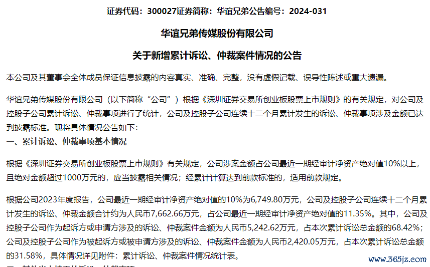 今年4月底,华谊兄弟公告表示,根据公司2023年度报告,公司最近一期经审计净资产绝对值的10%为6,749.80万元,公司及控股子公司连续十二个月累计发生的诉讼、仲裁金额合计约为人民币7,662.66万元,占公司最近一期经审计净资产绝对值的11.35%。