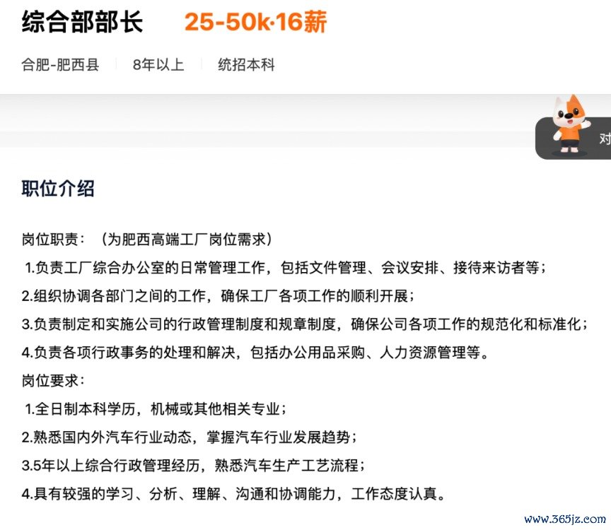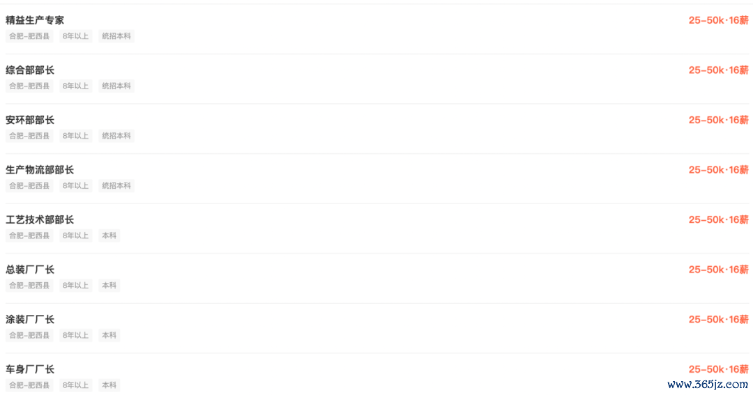 据第三方招聘平台显示,江淮肥西“超级工厂”招聘包括冲压厂厂长、车身厂厂长、涂装厂厂长、总装厂厂长、工艺技术部部长、生产物流部部长、精益生产专家等。