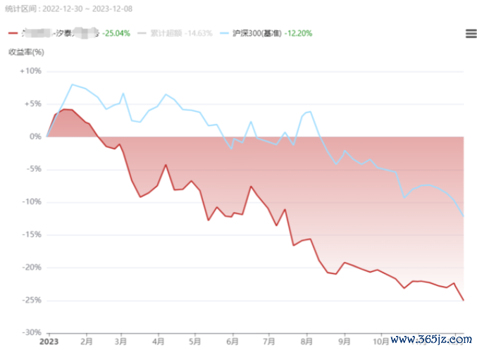 比如,2023年12月,一位投资者在火富牛论坛上展示了其持有的某只汐泰产品的净值曲线图。从图上看,这只产品截至12月8日2023年以来的回报率为-25.04%,大幅跑输沪深300指数(-12.20%)。