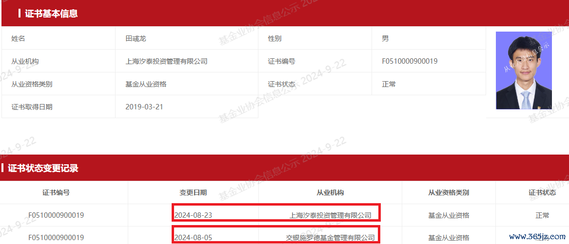 田彧龙在交银施罗德注销从业资格的时间是8月5日,在汐泰投资注册从业资格的时间是8月23日。